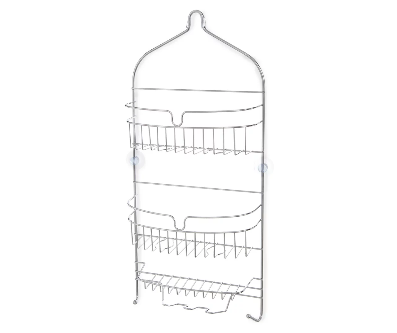 Keep your favorite bath products on hand with this 3-shelf hanging shower caddy by Kenney. This medium weight plated steel caddy easily hangs over your shower head. The chrome finish coordinates with your bath hardware. The deep wire shelves allow you to store your shampoo and conditioner bottles, shower gels and body washes. Shelves are designed to hold bottles upside down for easy dispensing. Includes two hooks for hanging loofahs and wash cloths, two razor holders and a soap shelf.