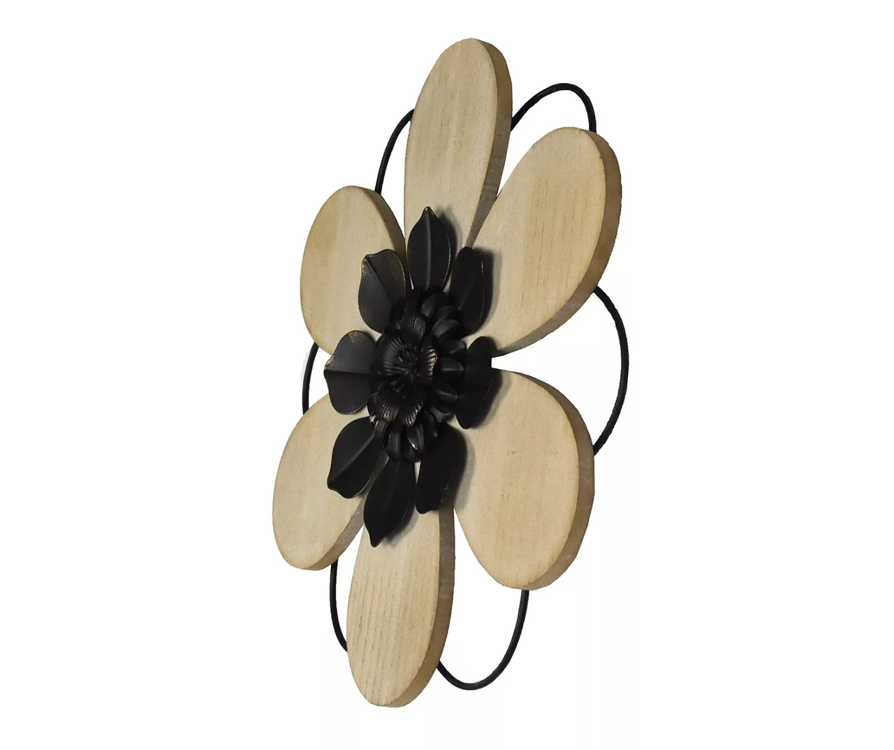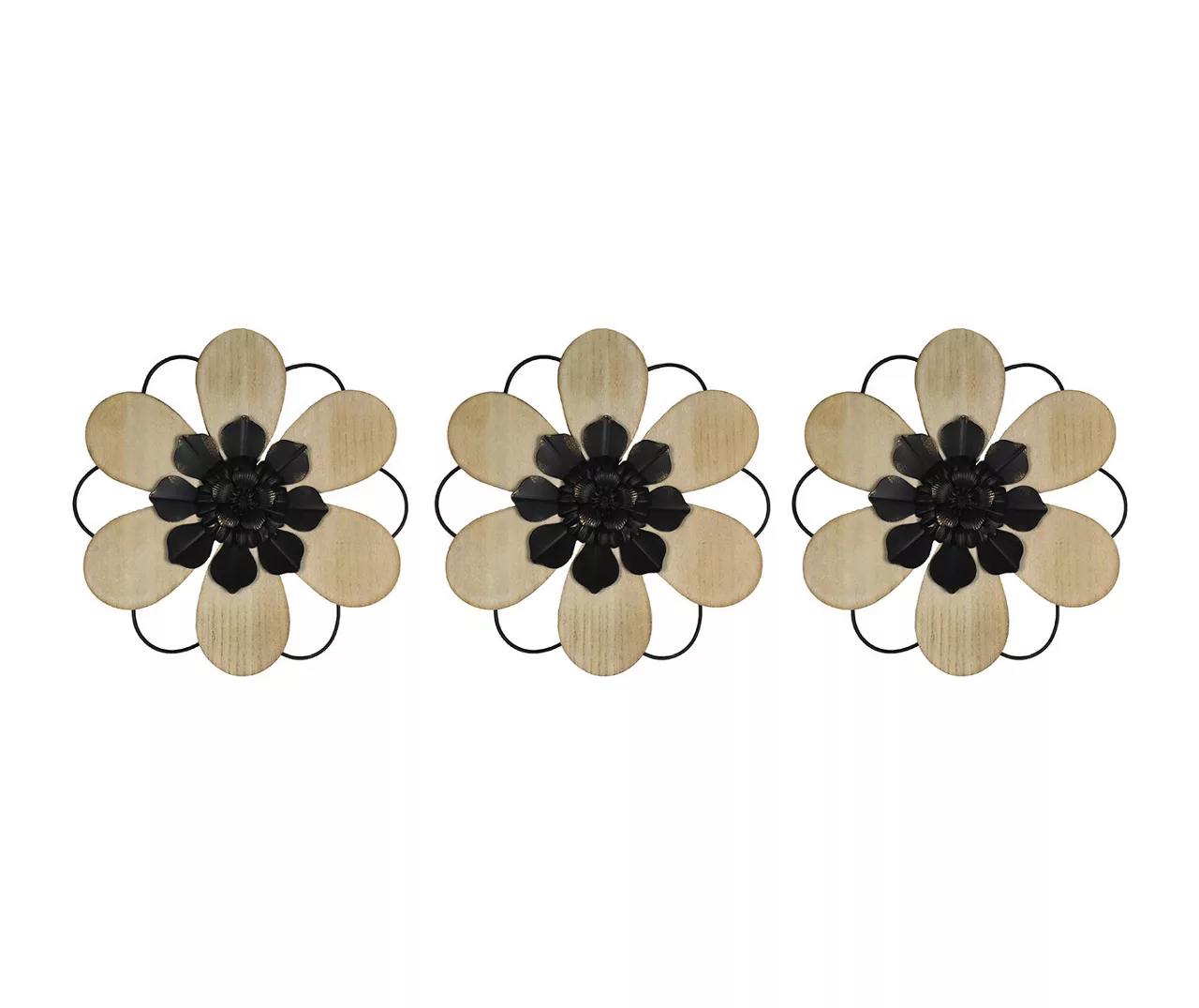 Bring blooming designs to your walls or halls with this set of décor. Cut-out flowers are made with mixed materials of brown wood and black metal.