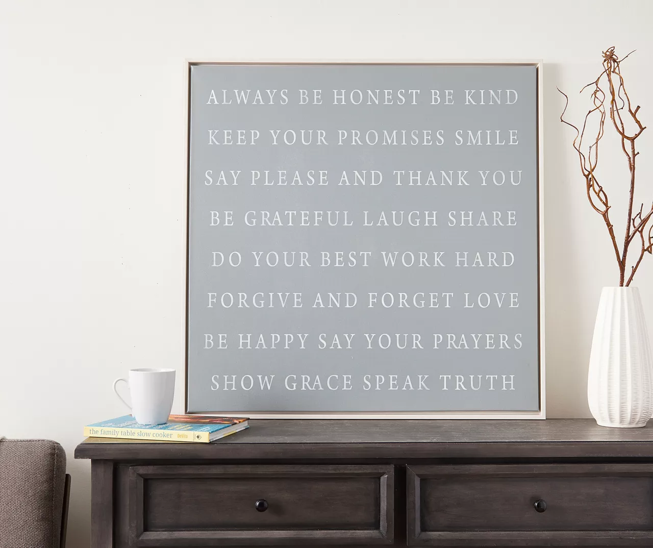 - “Always be honest, be kind, keep your promises, smile, say please and thank you, be grateful, laugh, share, do your best, work hard, forgive and forget, love, be happy, say your prayers, show grace, speak truth” messaging in white text on a light gray background