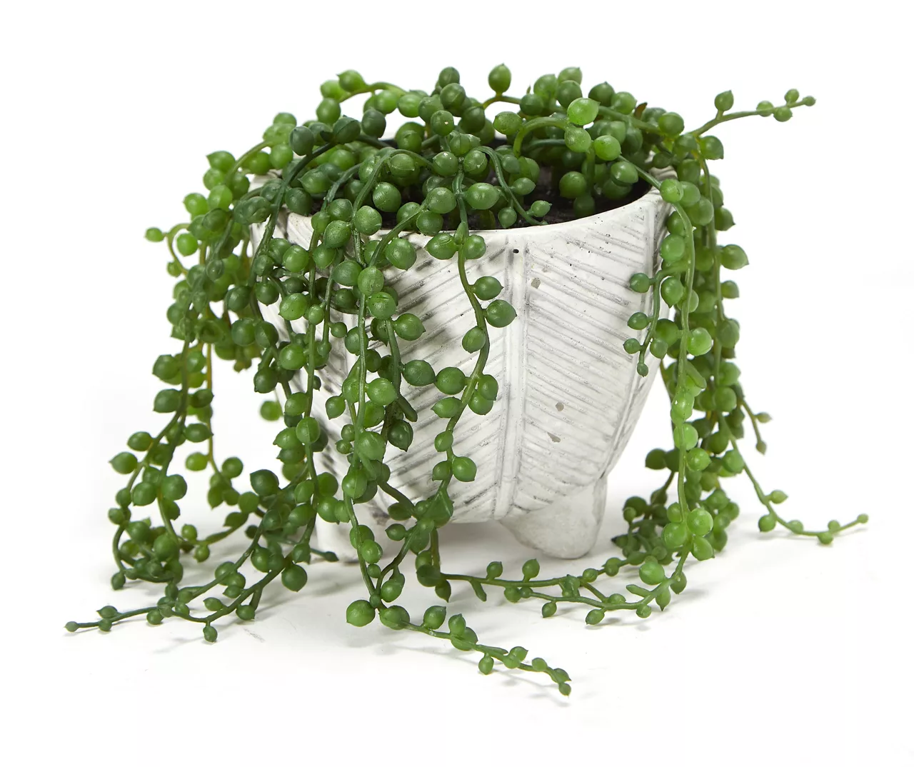 Display the beauty of this string of pearls plant without the stress! Artificial strands drape from a round footed pot accented with a herringbone pattern. This maintenance-free plant is perfect for showcasing on a mantel, table or shelf.