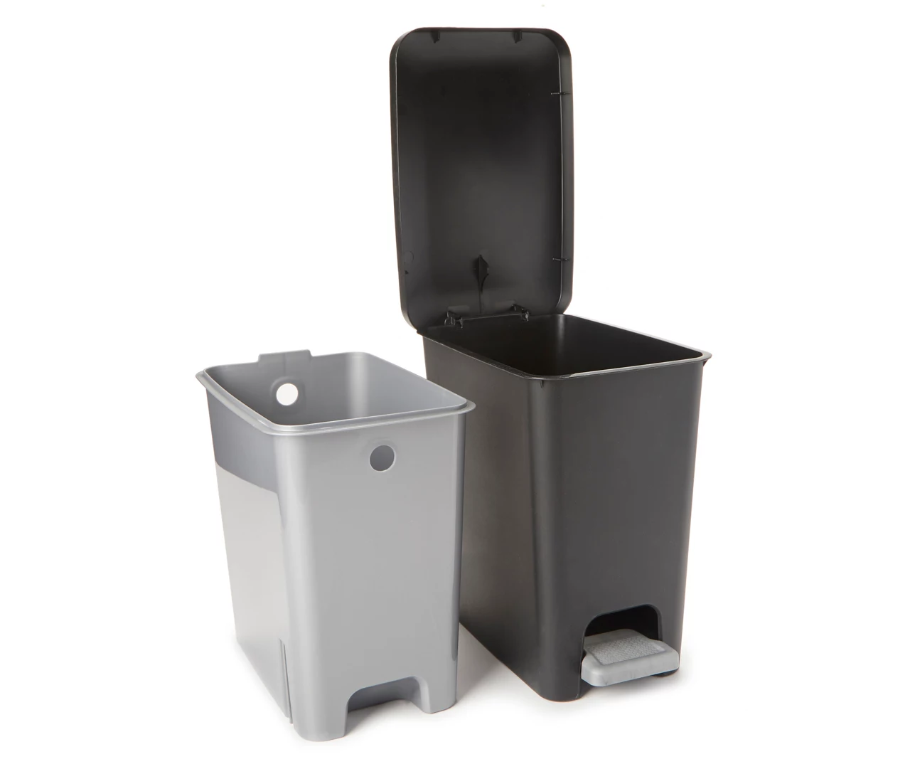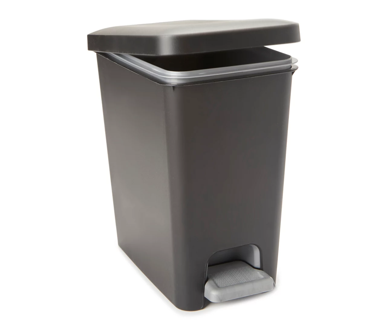 Open and close this trash can’s lid completely hands free just by stepping on the pedal. The design comes with a removeable gray plastic liner that can also serve as a separate trash or recycling bin.