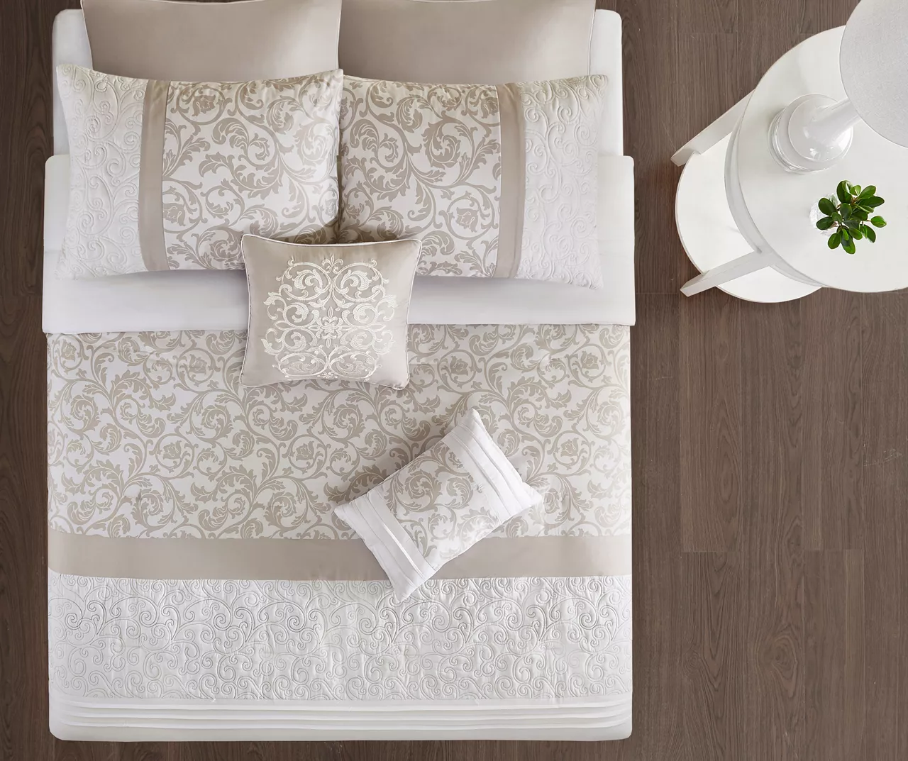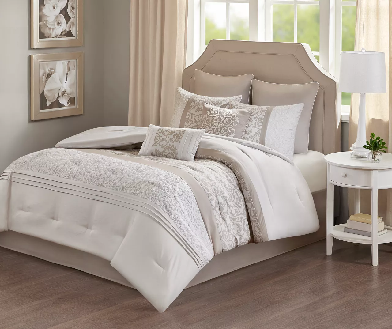 The Casey embroidered eight-piece comforter set introduces a graceful elegance to your bedroom décor. A pieced embroidery design with quilting and pintuck details adorns the face of the comforter and shams for a beautiful transitional look. Solid euro shams complement the top of the bed, while two embroidered decorative pillows and a solid bed skirt provide the perfect finishing touches. Made from ultra-soft microfiber, this comforter set is machine washable and offers a charming update to transform your bedroom.