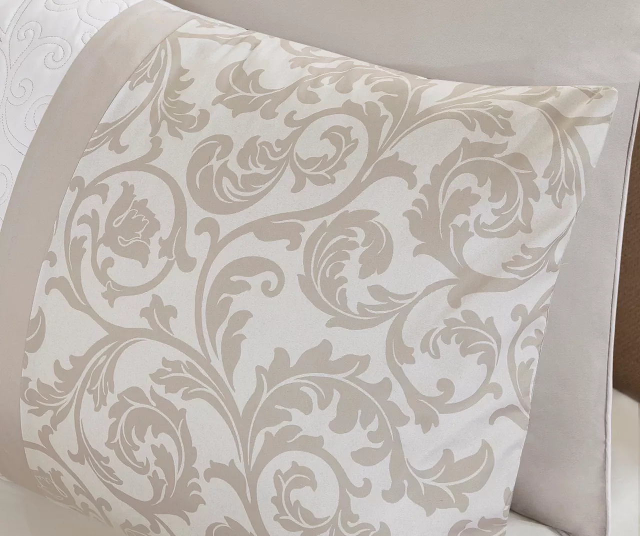 - Includes comforter, bed skirt, 2 – shams, 2 – euro shams and 2 – decorative pillows