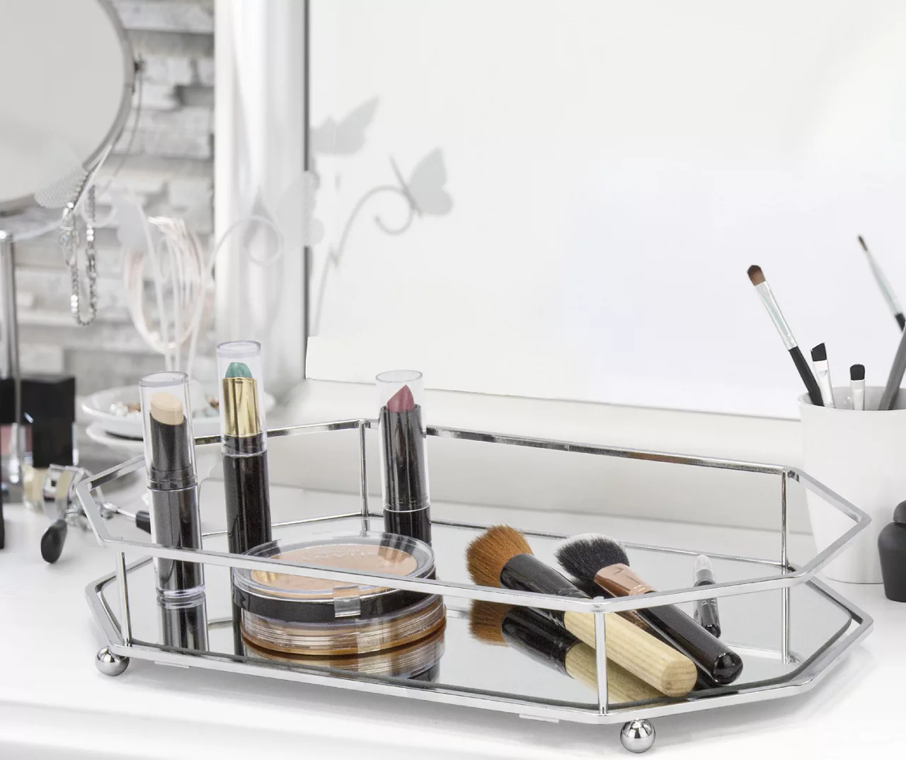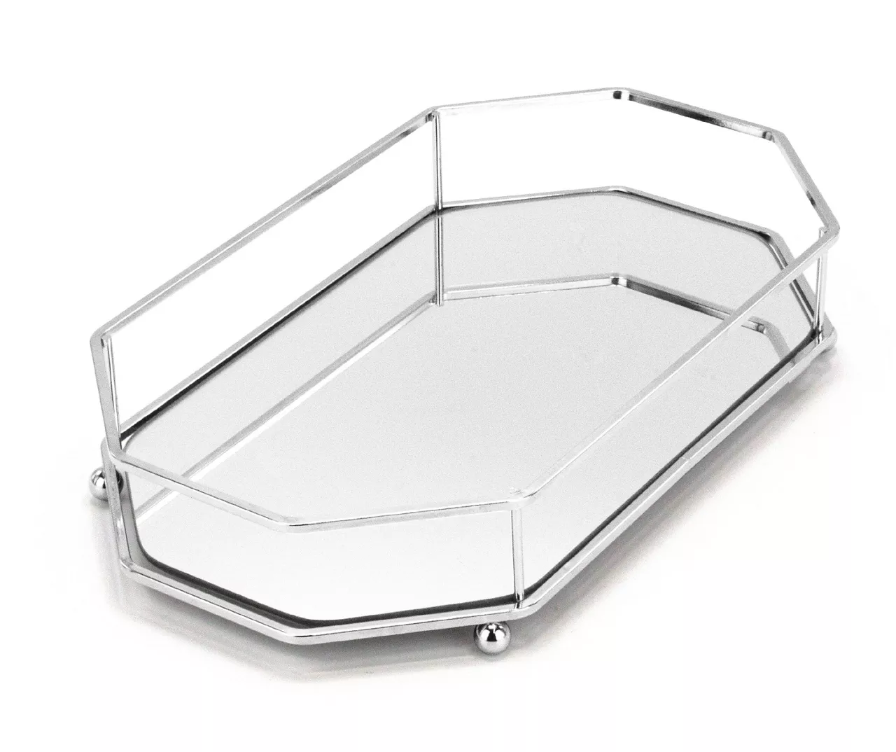 Glam up your vanity displays or countertop arrangements with this lovely tray from Brookstone. The geometric metal frame features single-bar sides finished in polished chrome with a mirrored bottom for eye-catching style.