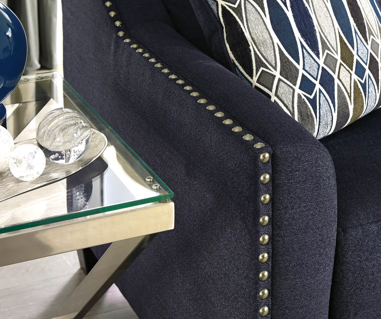 Upholstered in a striking midnight blue fabric with a soft brushed feel, this sofa is undeniably handsome. Sloping arms are beautifully outlined with brushed nickel-tone nailhead. Plush seating sets the scene for toss pillows immersed in a glasswork-inspired pattern design.