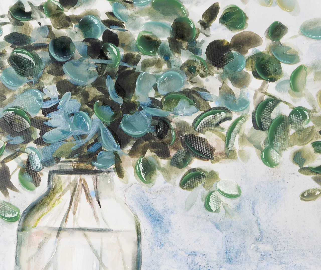- Simple eucalyptus arrangement in a glass vase in shades of green, blue and brown