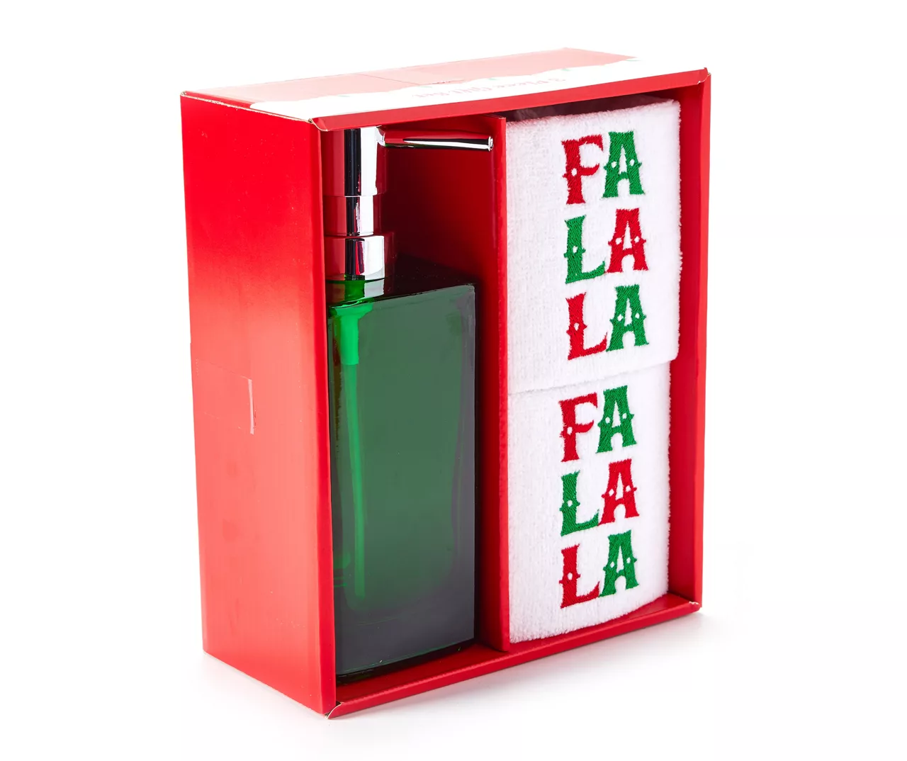 Bolster your home with very merry vibes with this three-piece set featuring two lavish cotton hand towels and a sleek glass soap dispenser. Bold colors and festive embroidered designs bring the holiday experience to your countertops, whether you opt to use this set in a bathroom or kitchen space.