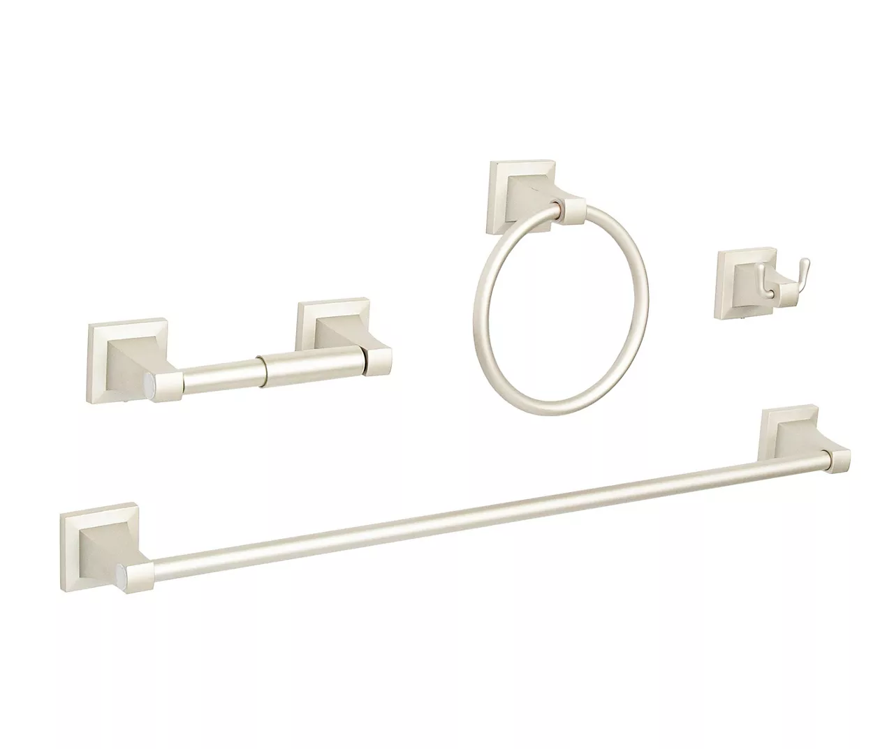 - Includes bath towel rod, hand towel ring, double towel hook, toilet paper holder and installation hardware