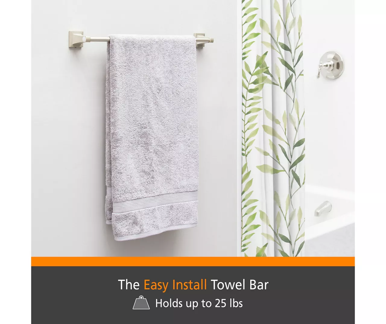 The Fast Fit™ Juliette 4-Piece Bath Hardware Set by Kenney® is as easy to hang as a picture frame and installs in just minutes. This convenient and rust-resistant 4-piece set includes a 24″ towel bar, standard toilet paper holder, towel ring and double towel hook in a lovely brushed nickel finish. Easy installation does not sacrifice performance, as Fast Fit™ Bath Hardware provides excellent support.