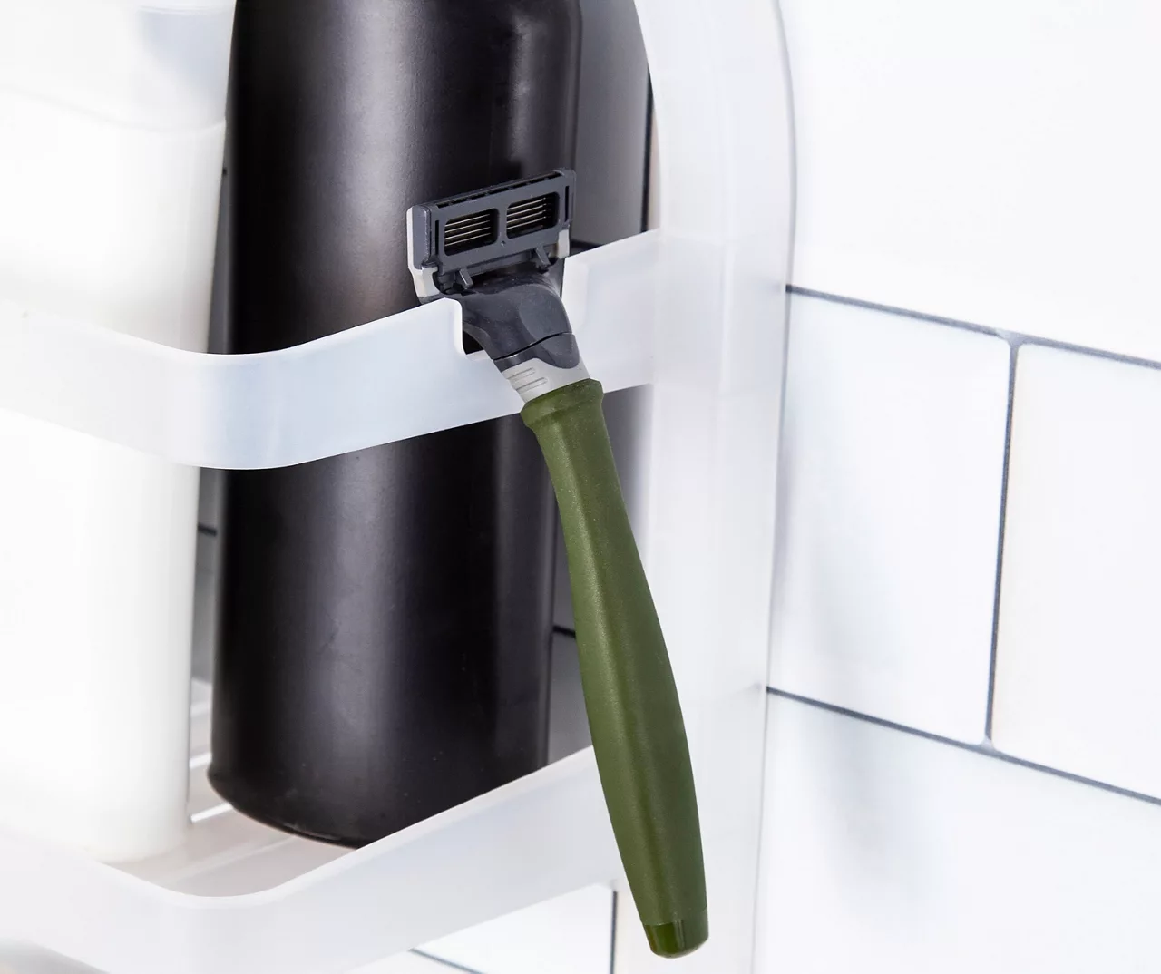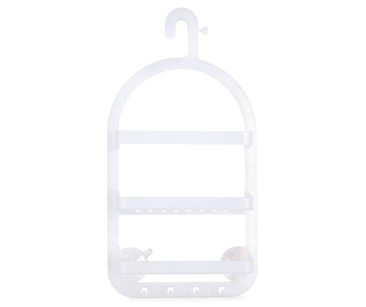 Organize your bath and maximize your storage with the hanging shower caddy. The frosted finish and soft curves bring a more modern, yet functional, style to this classic bathroom storage solution. This caddy features two shelves, hooks for razors, poufs and wash cloth storage. The hanging caddy is self-draining and easy to clean. Made of durable plastic, it is also resistant to rust. The caddy includes a slip-proof collar that fits most standard shower heads and suction cups to secure in place.