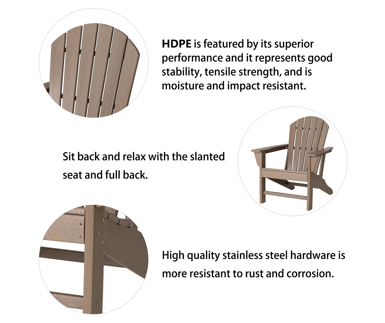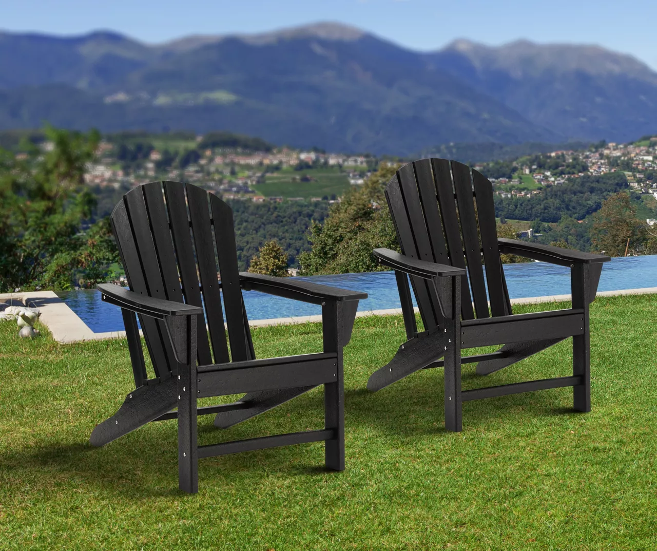 This set of two Adirondack chairs lets you enjoy casual conversations and happy hours with friends in your outdoor space. Each chair is constructed of durable and all-weather resistant high density polyethylene, making them easy to clean with little maintenance. Slanted seating and full backs hug you in comfort as extra-wide paddle armrests are at the ready to hold a drink. This versatile Adirondack chair set is perfect for your patio, porch, poolside, garden, backyard or any other outdoor space!