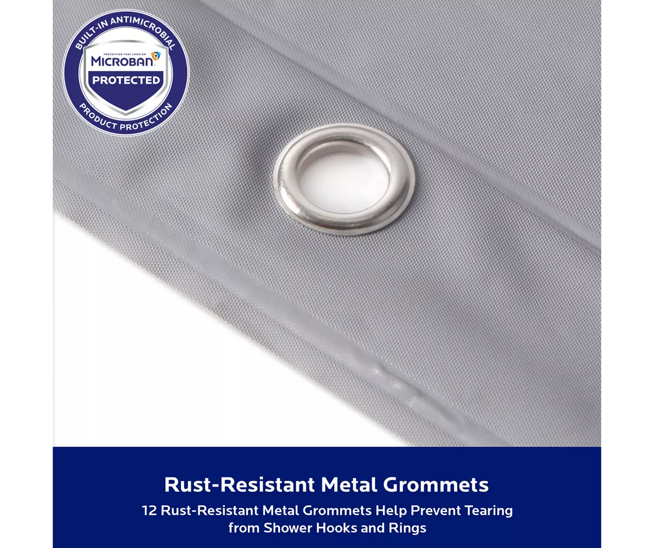The Kenney® medium-weight PEVA shower liner with Microban® antimicrobial technology inhibits the growth and reproduction of odor-causing bacteria, mold and mildew and provides enhanced product protection from microbes. This shower liner is made to fit most standard tubs and is crafted from sturdy PEVA topped by 12 rust-resistant metal grommets. A weighted hem helps keep the liner in place and reduces billowing.