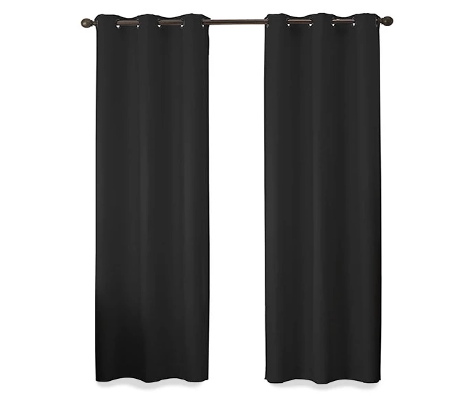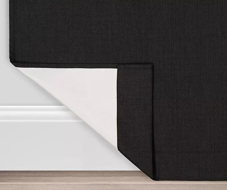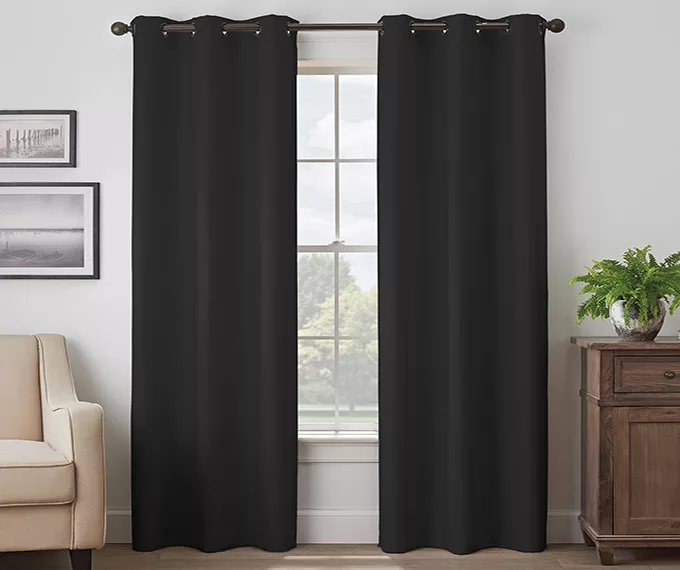 Find the perfect combination of fashion and function with the black Eclipse Martina window curtain. This beautiful panel offers Absolute Zero 100% blackout benefits and features a textured basketweave design in versatile black. It’s perfect for the bedroom, living room, dining room or office. Innovative foam backing is applied to the fabric and allows you to enjoy all of the light-blocking, noise-reducing and energy-saving benefits, while providing the same fashionable style and elegance of naturally flowing curtains.