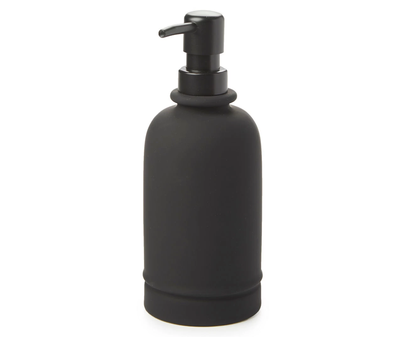 Complement your modern bath or kitchen space with the matte rubberized look of this pump that can be used with your favorite lotions, soaps or sanitizers. Black metallic hardware finishes off the look with ultramodern flair.