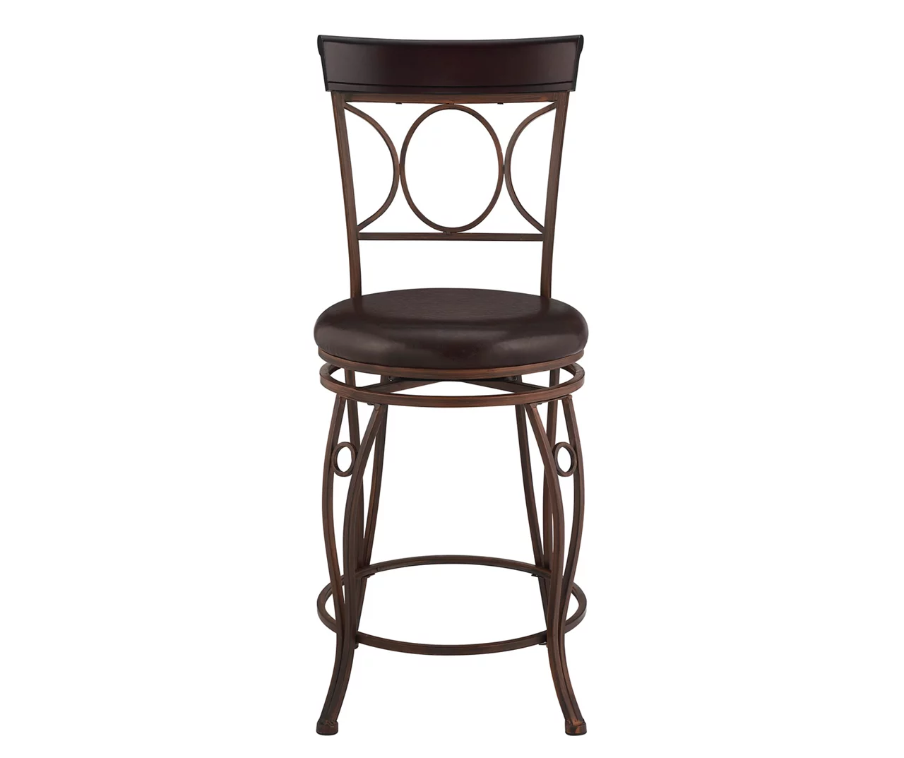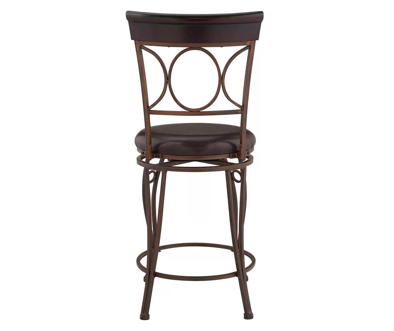 Sleek circles contrast with the sharp lines of this counter stool giving it a contemporary look that enhances any home. Sturdy yet sophisticated, this stool features a metal frame fitted with foot rests for a comfortable yet stable feel. Cushioned faux leather upholstery mimics the supple look and feel of real leather combined with long-lasting durability and easy care.