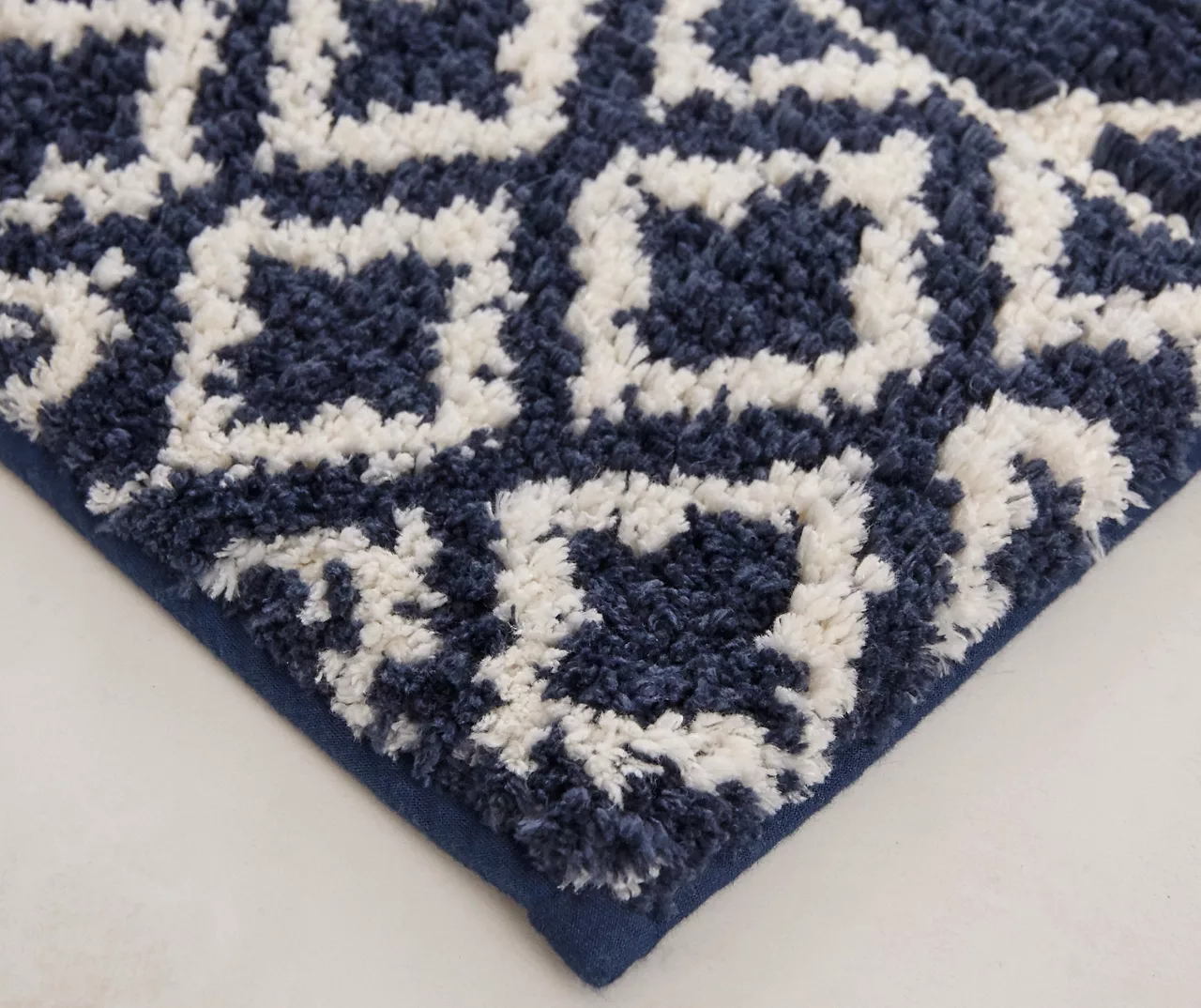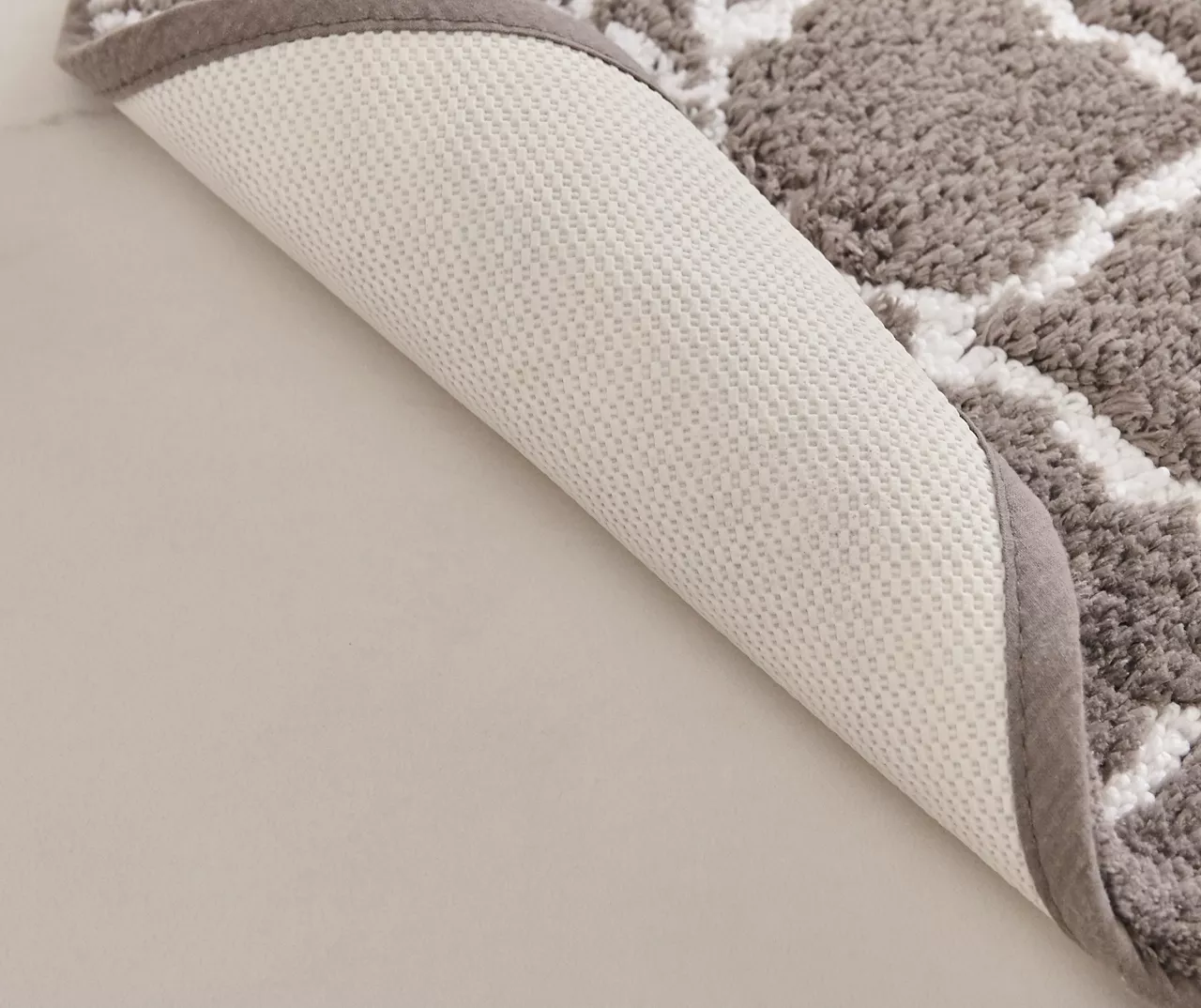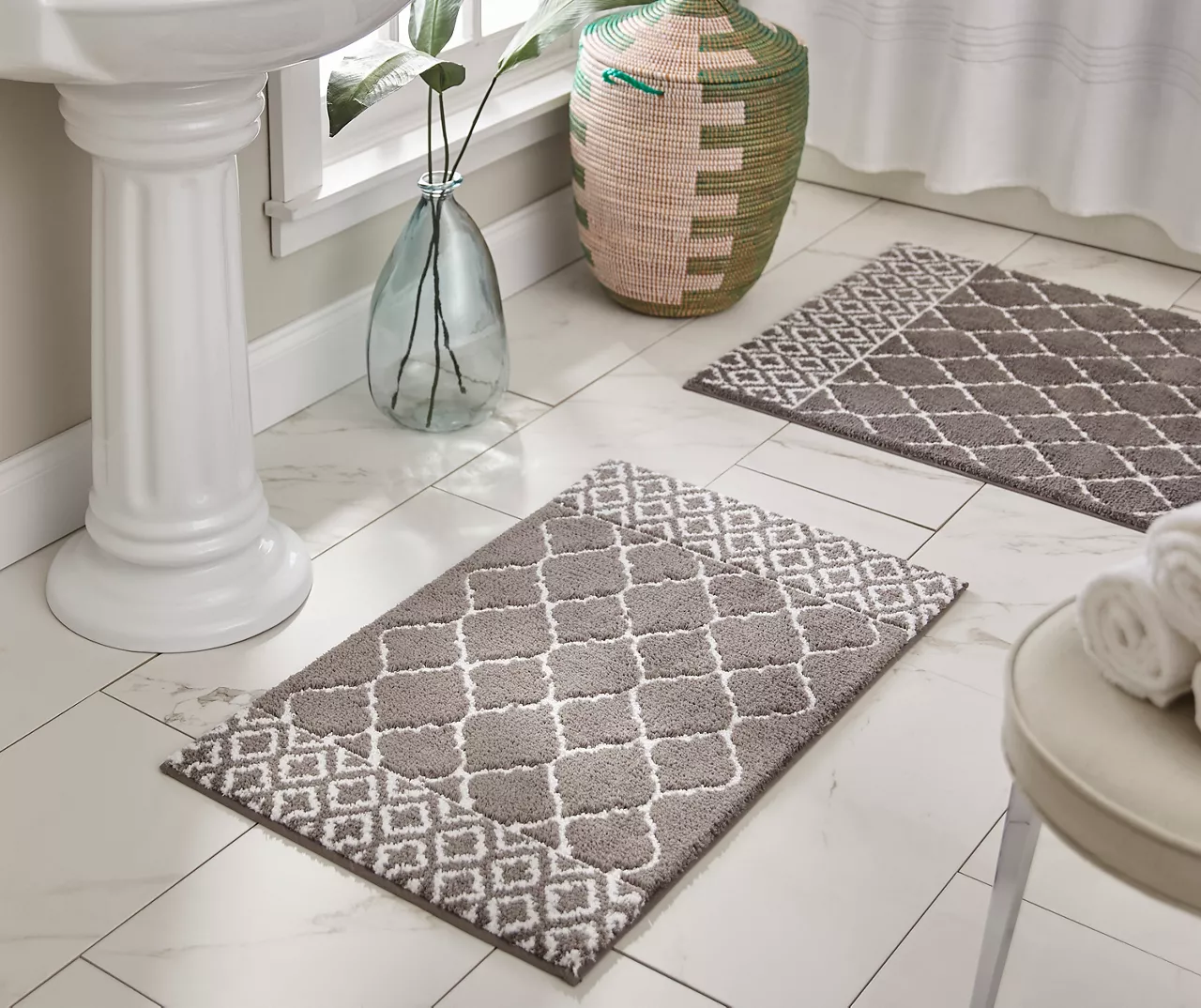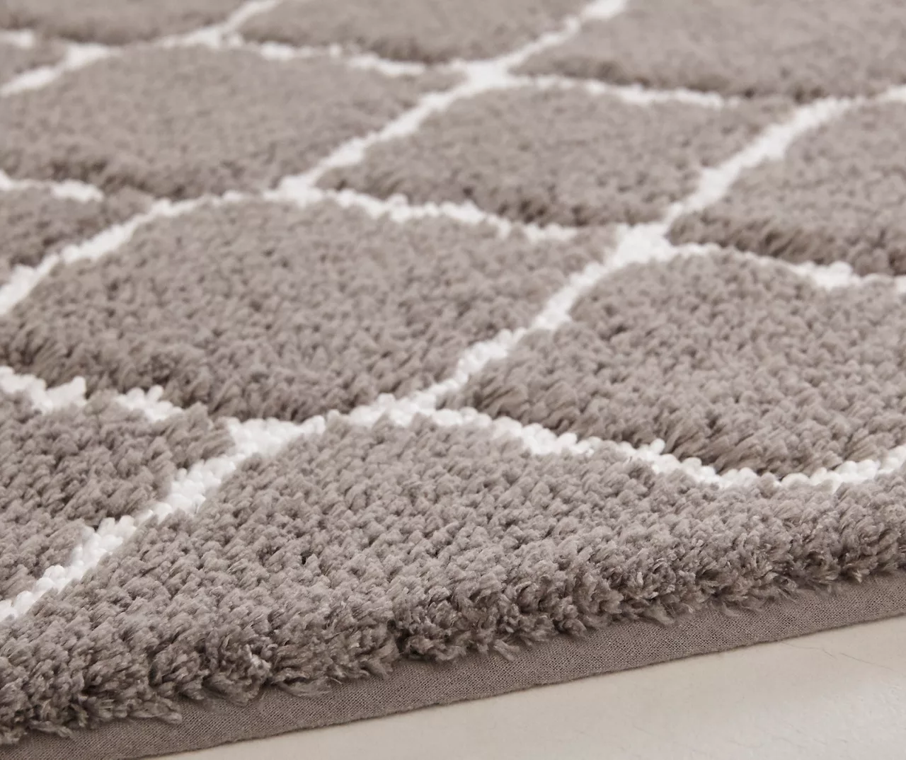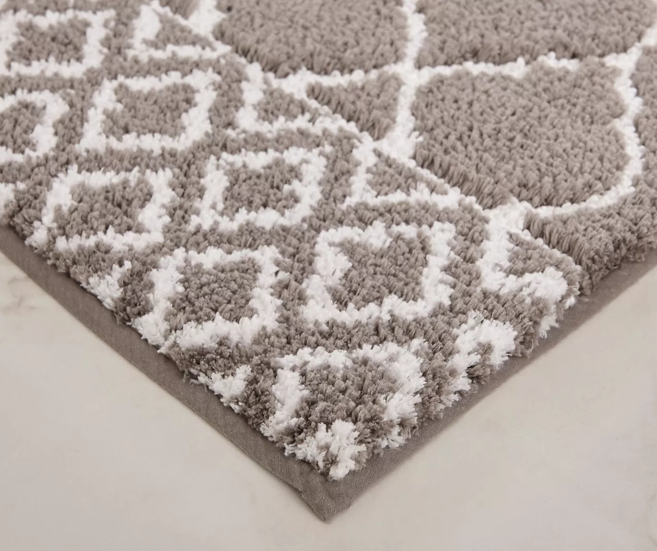 Decorate your bathroom floors with the modern refinement and plush comfort of this Fountainbleau rug from Mohawk’s Horizon collection. A quatrefoil lattice in the middle is framed by diamond patterning on the sides creates a contemporary-chic look, and the soft polyester pile keeps feet happy and while being machine washable for easy care.