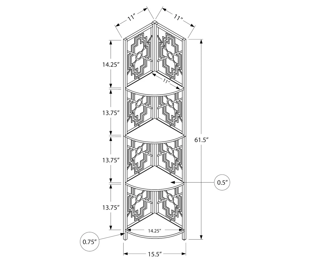 Let this stylish corner bookcase conquer the clutter in your home, apartment or condo. The black metal frame features a transitional design with four matching display shelves perfect for photo frames, plants, accessories and other decorative items. This storage accent piece will add a touch of elegance to any room in your home.