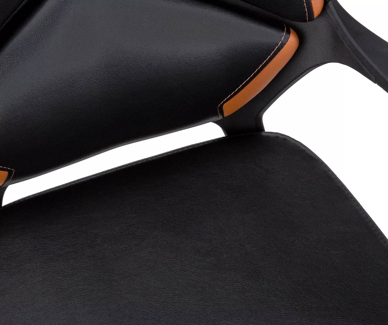 - Upholstered in durable and breathable black faux leather material with brown accents