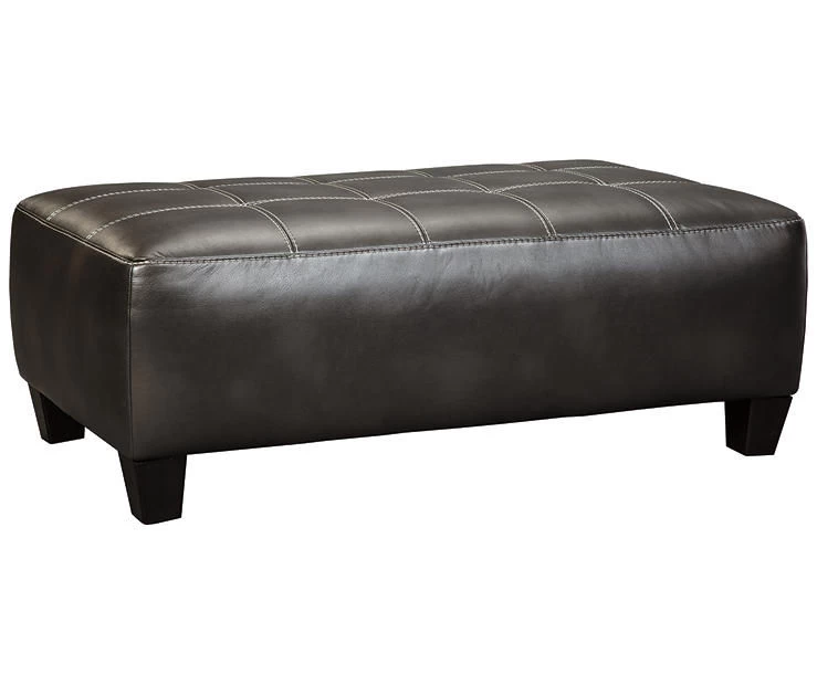 Simply put, the Nokomis oversized ottoman is anything but ordinary. Inspired by contemporary euro leather, this ottoman has charcoal gray faux leather with embossed natural grain effect and a matte finish. It features light gray stitching for contrast and tufting on the top for a look that adds style to any room. More than generous in scale, this accent ottoman is in a league of its own.