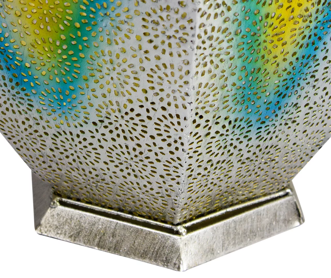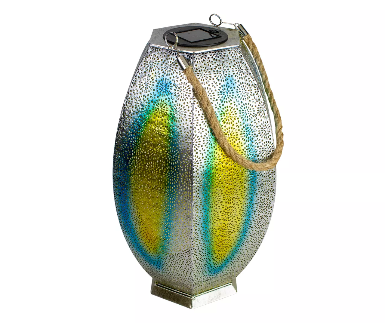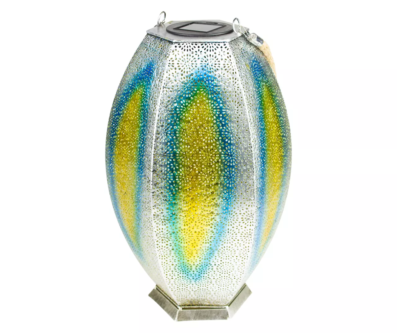 Traditional meets modern with this silver floral cutout hanging solar lantern. This stylish lantern contains a warm white LED bulb allowing for modern style combined with reliability and energy savings. The sleek silver finish with red and yellow highlights adds to the unique look of the lantern while also helping to prevent rust. Transform your outdoor space by replacing your lighting to add an elegant touch.