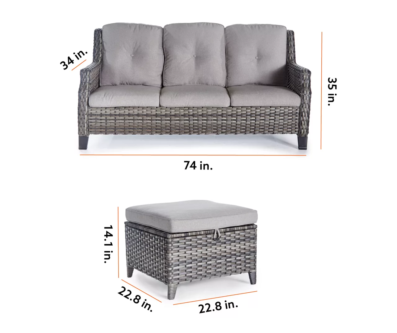 - Includes outdoor sofa with cushions and 2 ottomans with cushions