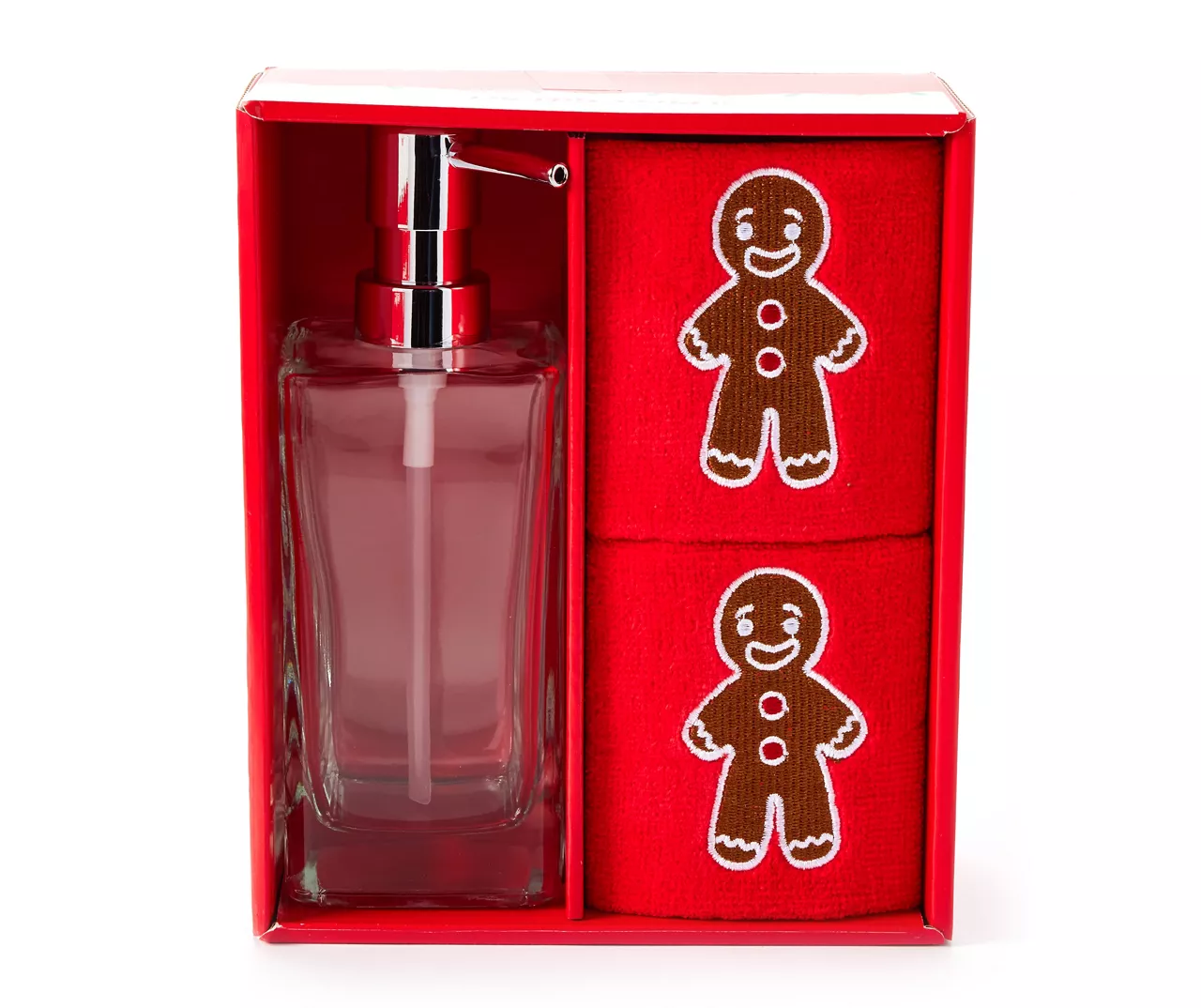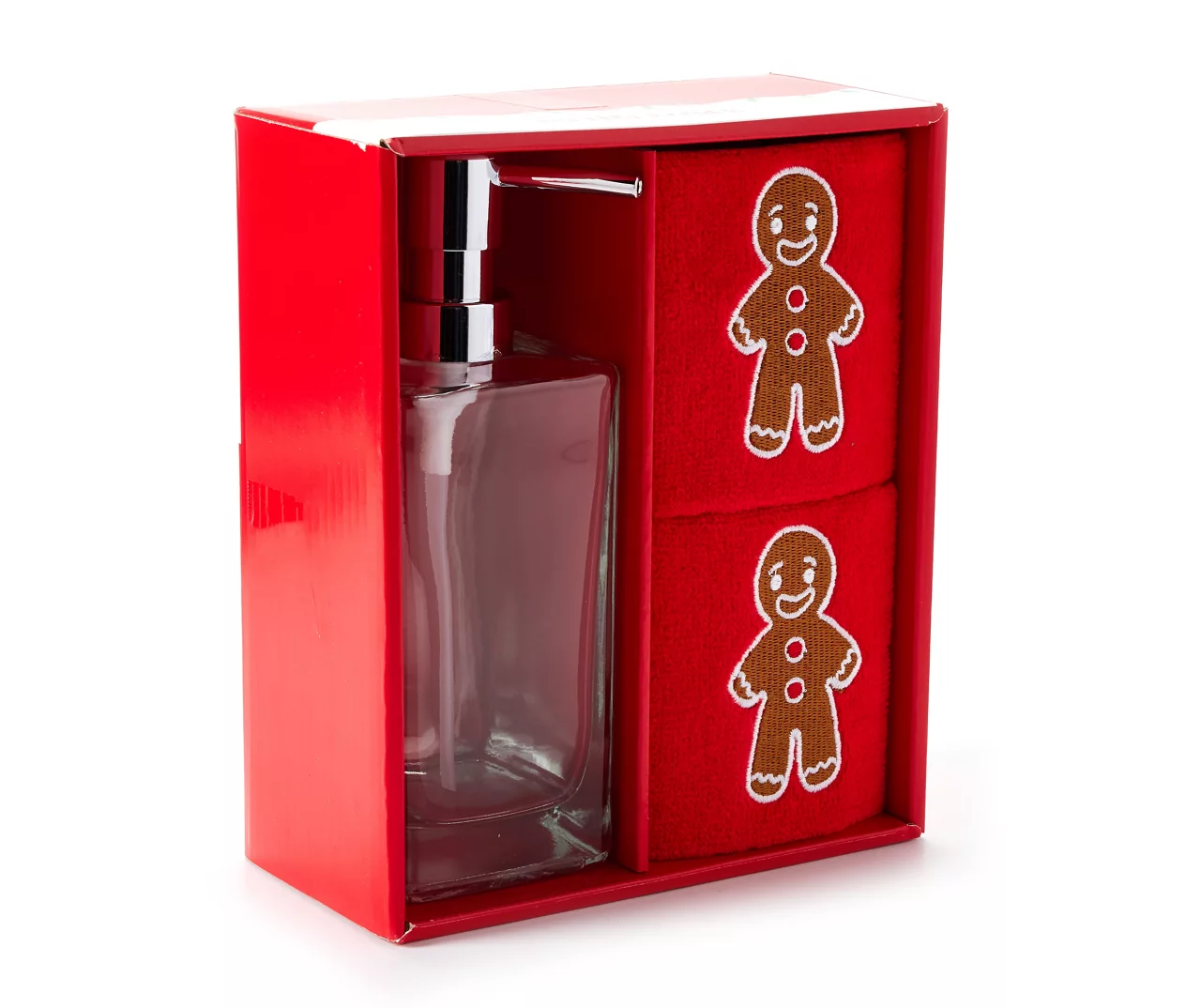 Bolster your home with very merry vibes with this three-piece set featuring two lavish cotton hand towels and a sleek glass soap dispenser. Bold colors and festive embroidered designs bring the holiday experience to your countertops, whether you opt to use this set in a bathroom or kitchen space.