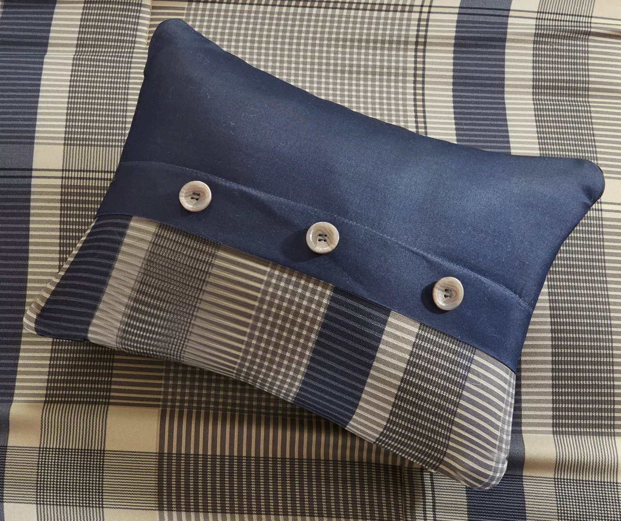 - Crisscross plaid design in a lovely navy and beige palette