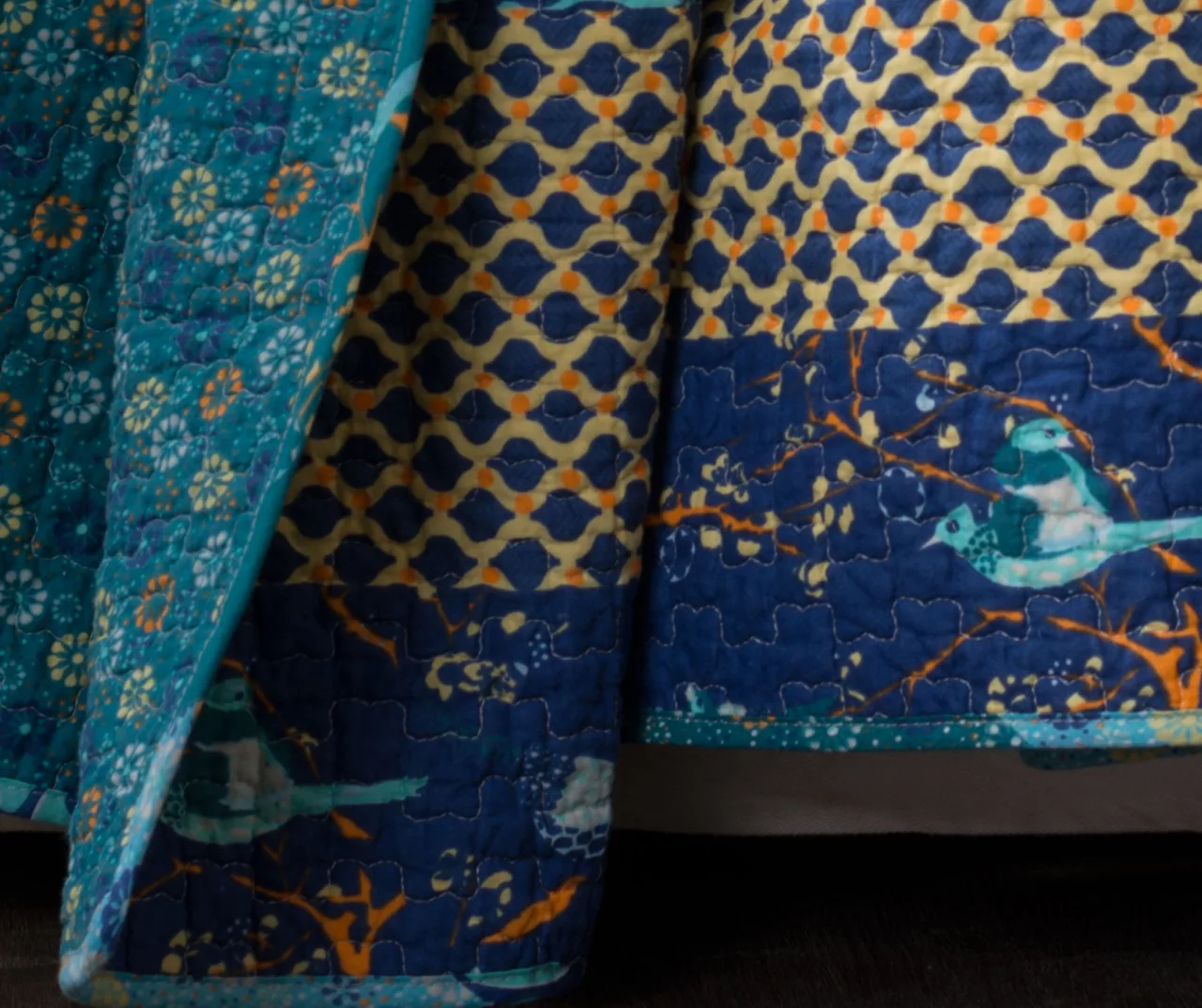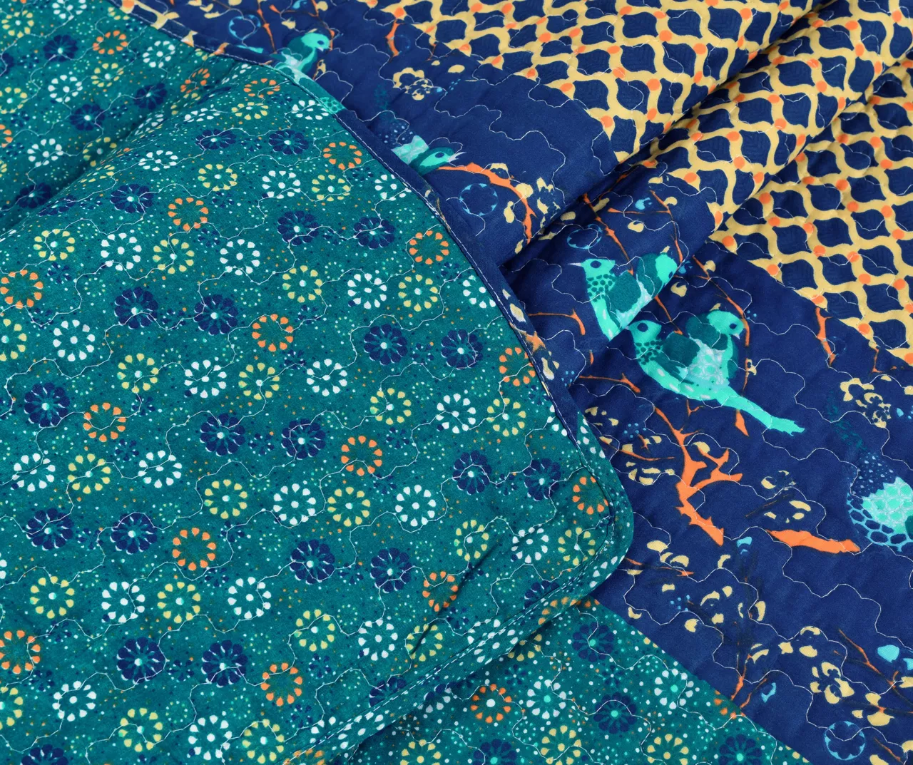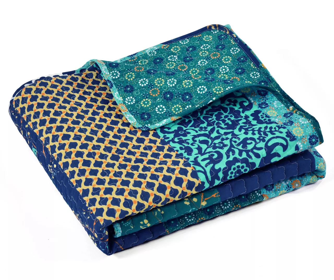 A variety of intricate prints arranged in color blocked sections brings eclectic boho flair to this quilted throw crafted from breathable cotton for cozy comfort that lasts through chilly days and evenings.