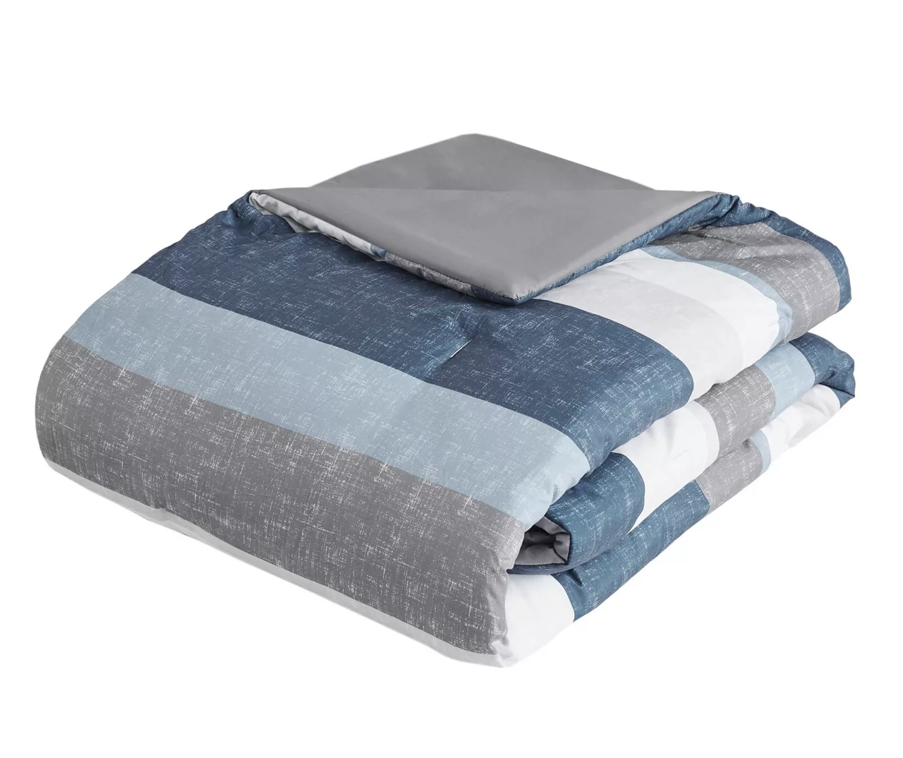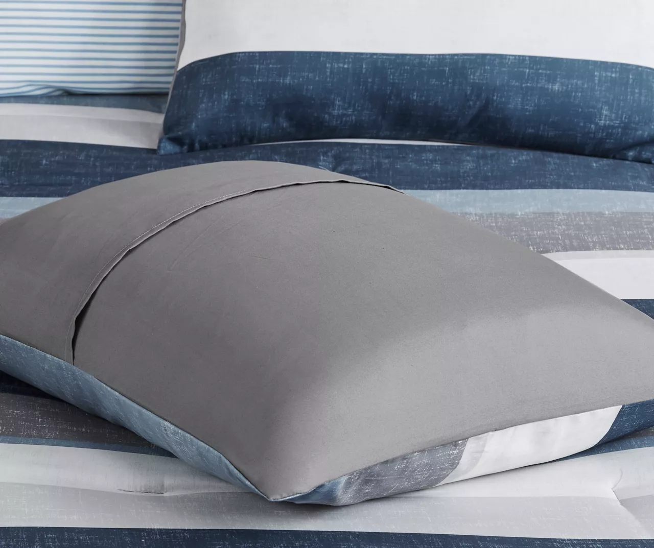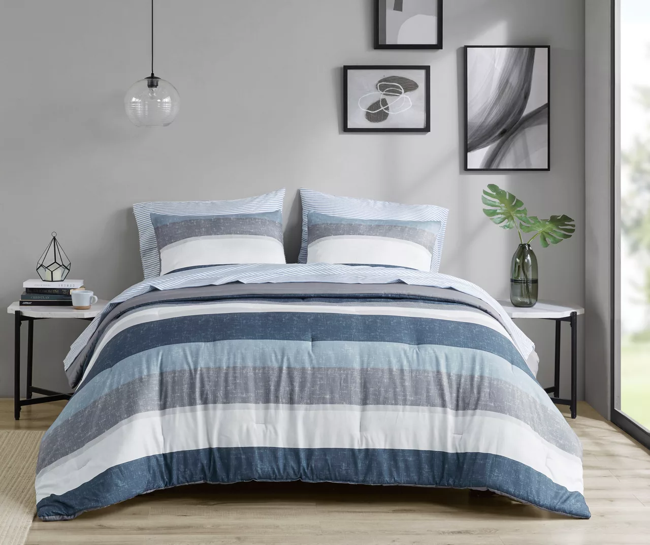 Revamp your bedroom style with this lovely Ryder bed-in-a-bag set. This modern comforter set features a stripe pattern in alternating blue and gray colors that pairs with a solid reverse to create a casual vibe. The included sheet set has a simple pinstripe design that complements the soft and cozy comforter’s look.
