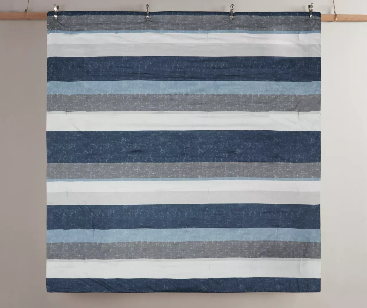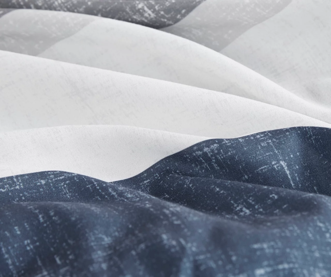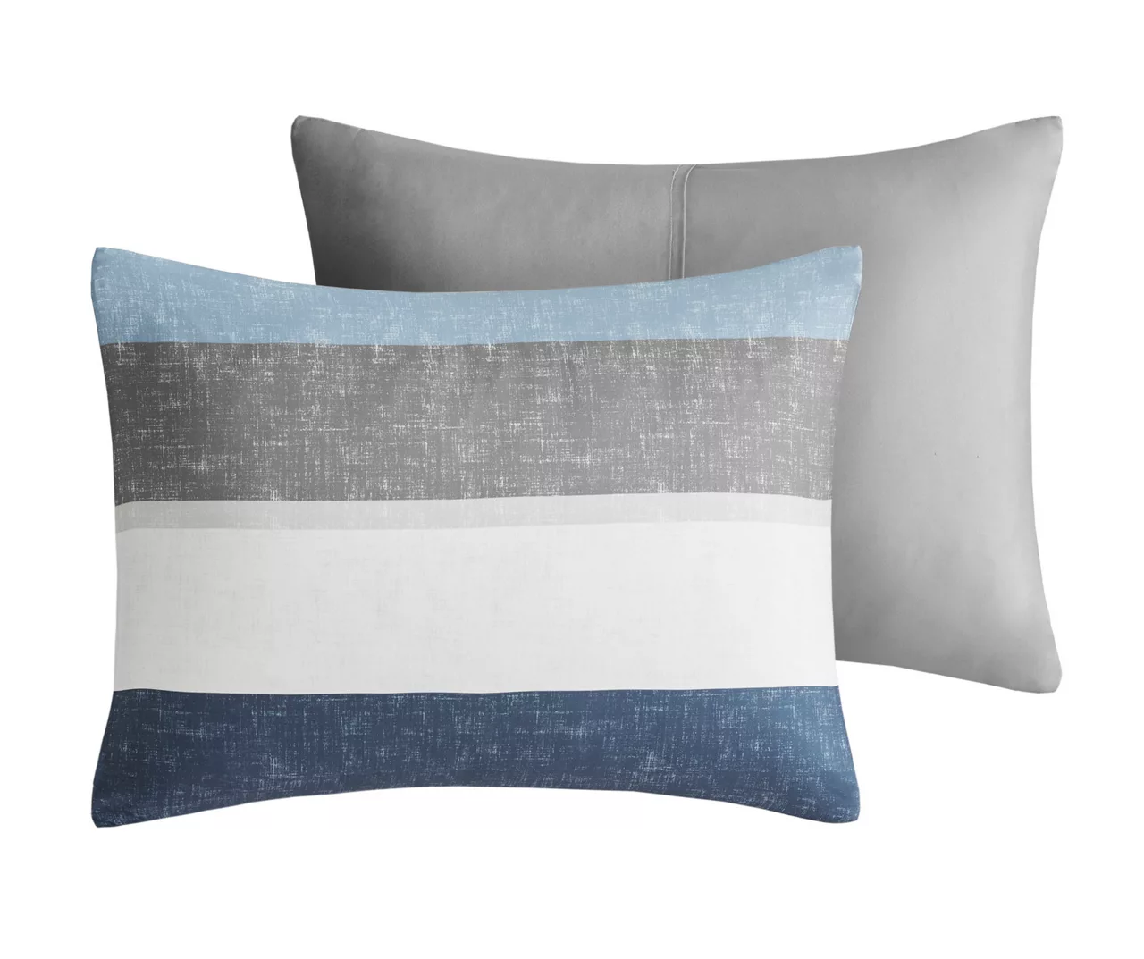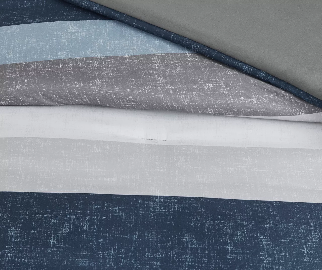 Revamp your bedroom style with this lovely Ryder bed-in-a-bag set. This modern comforter set features a stripe pattern in alternating blue and gray colors that pairs with a solid reverse to create a casual vibe. The included sheet set has a simple pinstripe design that complements the soft and cozy comforter’s look.