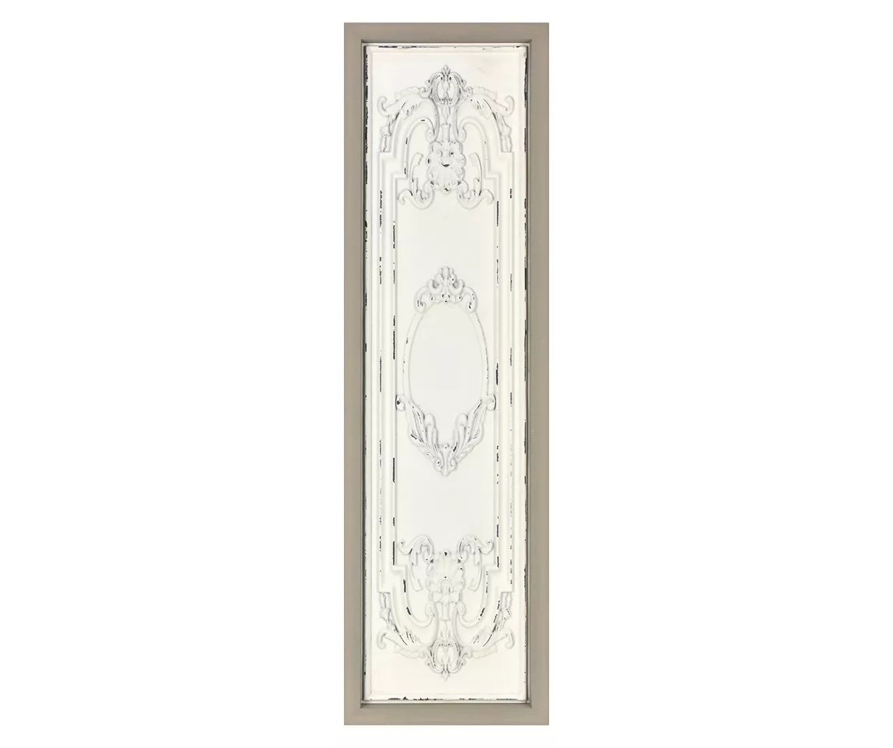 Add a chic, industrial touch to your home with this framed décor. An embossed filigree design is featured in white with a distressed effect.