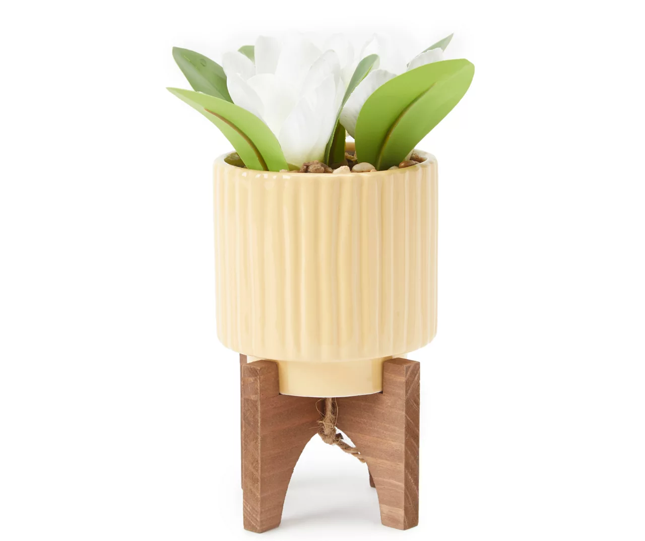 Spruce up your space with greenery that lasts when you add this artificial floral arrangement to your décor. It’s housed in a pastel yellow ceramic pot that’s elevated by a handsome wood stand. Brown and white pebbles top off the pot, and lifelike details bring a sense of realism to the plant.